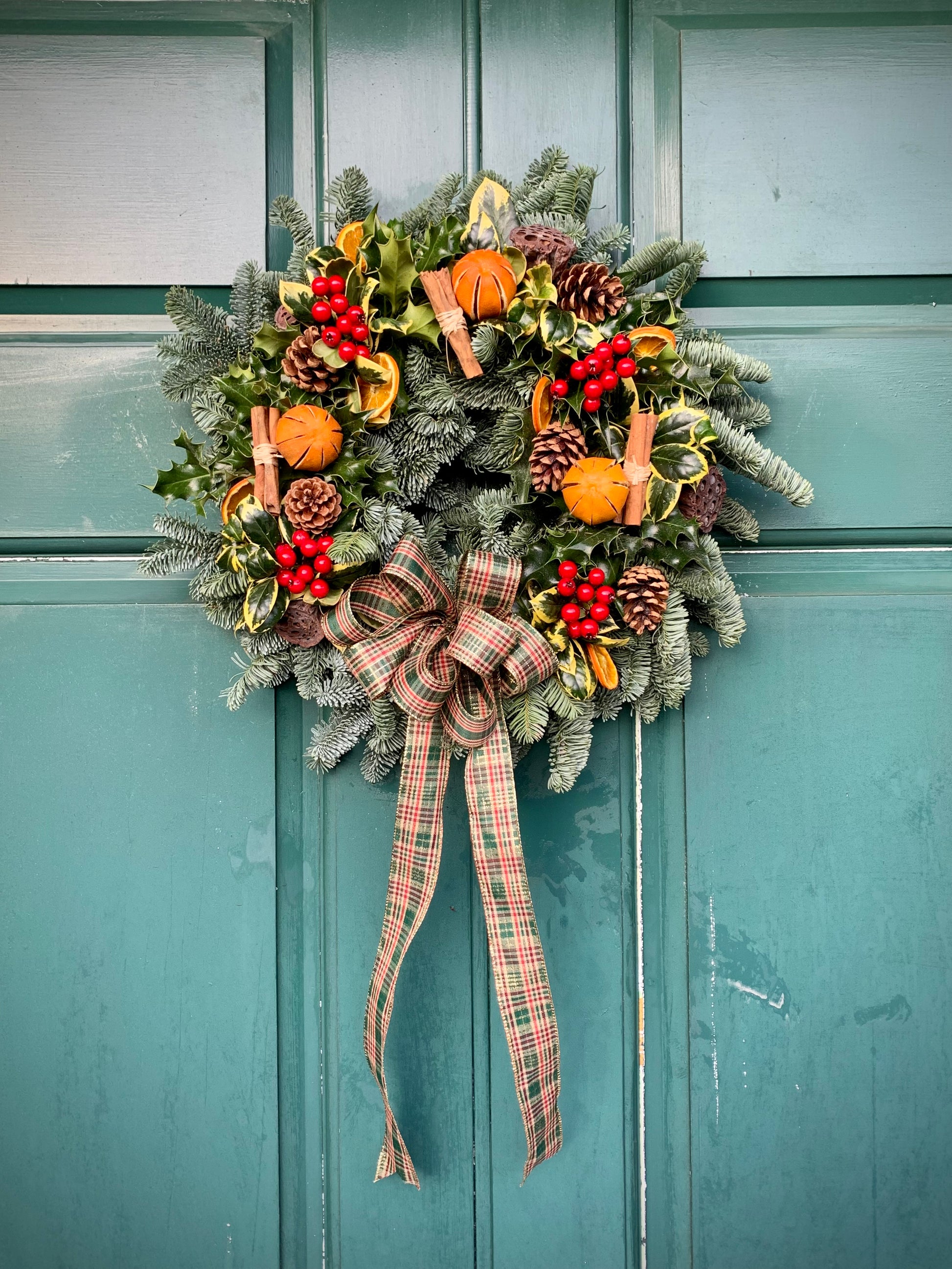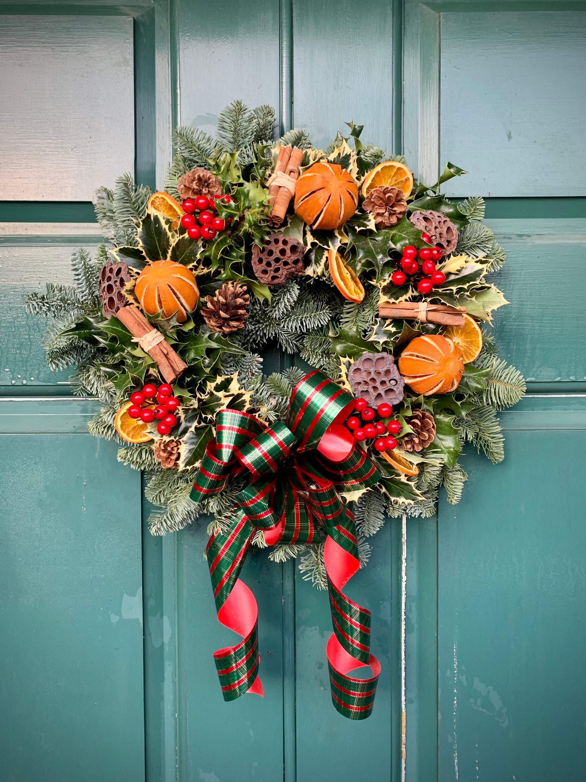 Pre Order - Available from 22nd November onwards Please Note: Free In store collection and local van delivery (up to 12 miles & priced by distance) available for this product For collection please click 'Pickup In Store' and select your desired collection date/time from the calendar For local delivery select shipping and click 'Local Delivery' at checkout, ensuring to leave your desired delivery date in the instructions box. Minimum of 24 hours notice, same day delivery is not available.  Local delivery is NOT available when using express PayPal checkout This decorative wreath is lovingly made in-house by our talented floristry team and is...